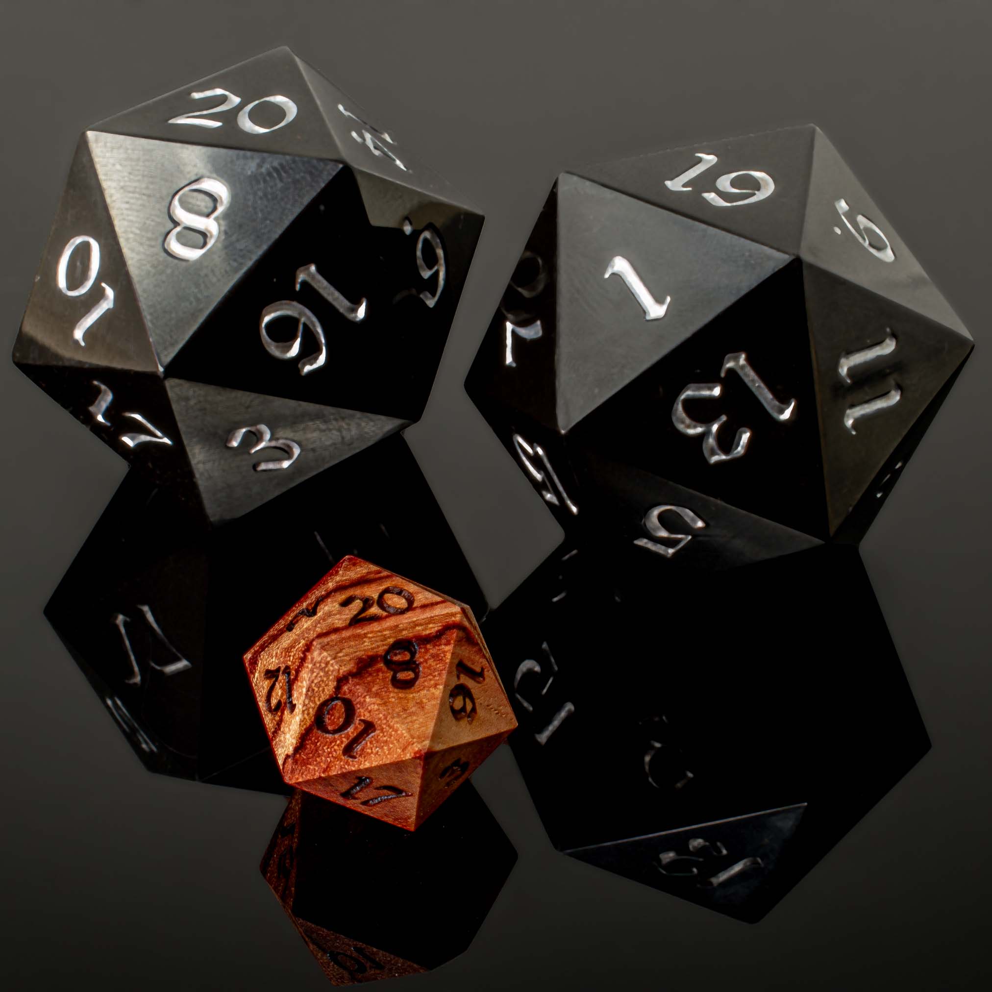 Jet despite its historical use as a gemstone, isn’t really a gemstone. Jet is in the same family as pearls and amber, since it is an organic material. Jet is formed from super compressed decayed wood mixed with a touch of salt water then cooked for eons in the warm oven of Earth’s crust. These D20’s are massive coming in at 8 times the weight and volume of a standard D20. The tulip wood d20 is shown for scale only and not included with the Big Ass Coal D20.