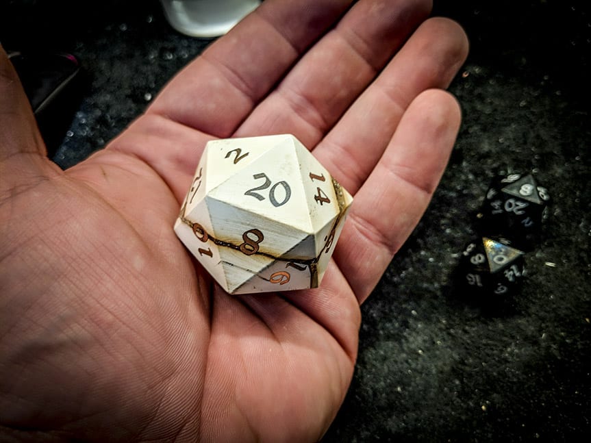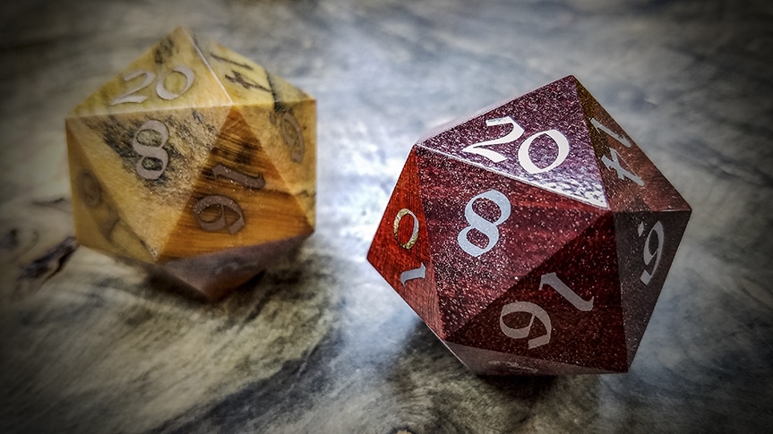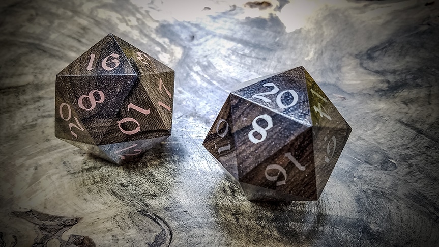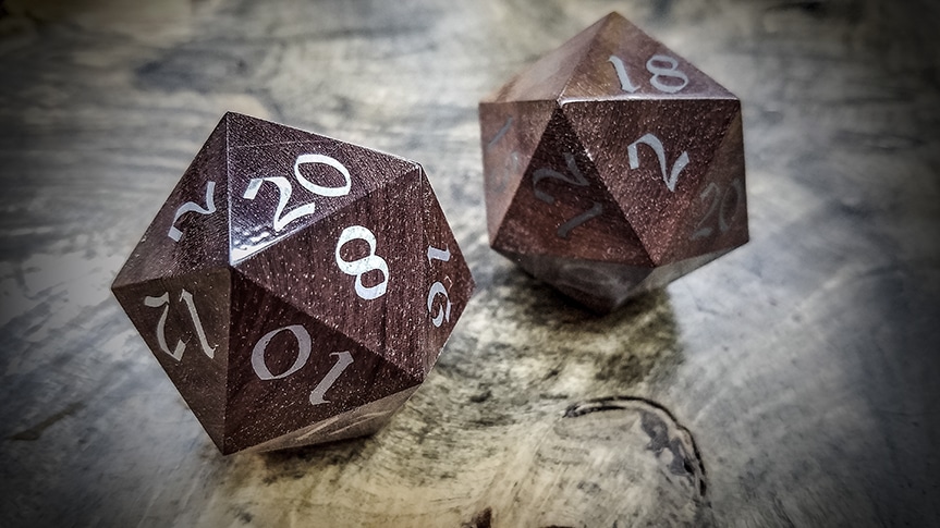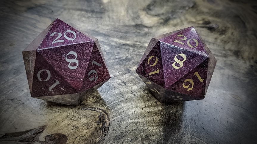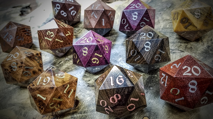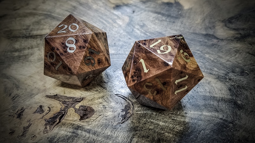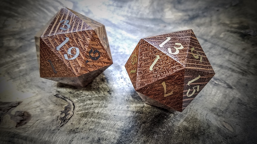 Our Big Ass d20s are crafted from solid billets of exotic woods and at this scale the grain and figure of these exotic woods is showcased in a manner that just isn't possible at our standard ¾" scale. You'll also find that some (not all) of our Big Ass d20s have been inlaid with various metals from Turquoise to, Copper, Brass and Bronze, to Electrum, and 99% pure Silver.