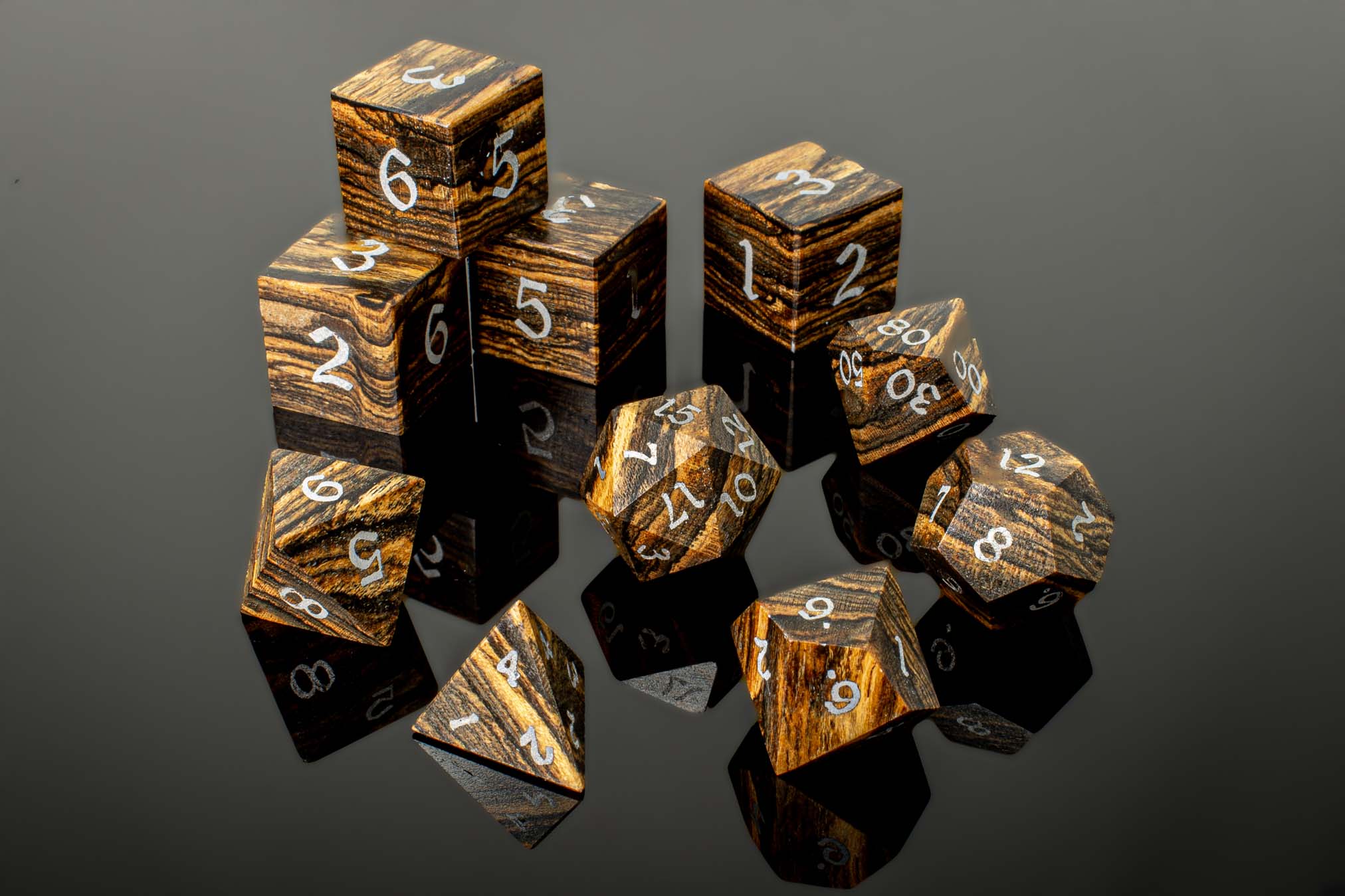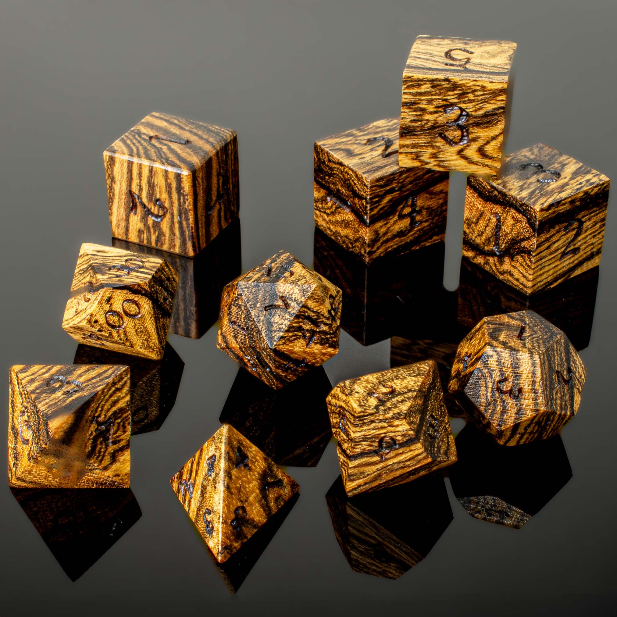 Bocote is a prized tropical hardwood from Central and South America. Known for its oily nature, dense hardwood, and captivating wild striping, Bocote is not just any wood – it’s the top pick for crafting rifle butt stocks, knife handles, and guitar bodies. As you roll these Bocote wood dice, you’re holding a piece of history – once the go-to for Maya civilization’s intricate carvings and sacred objects. The dark brown or black streaks create a striking yellow and black appearance, making each dice a visually distinct work of art.