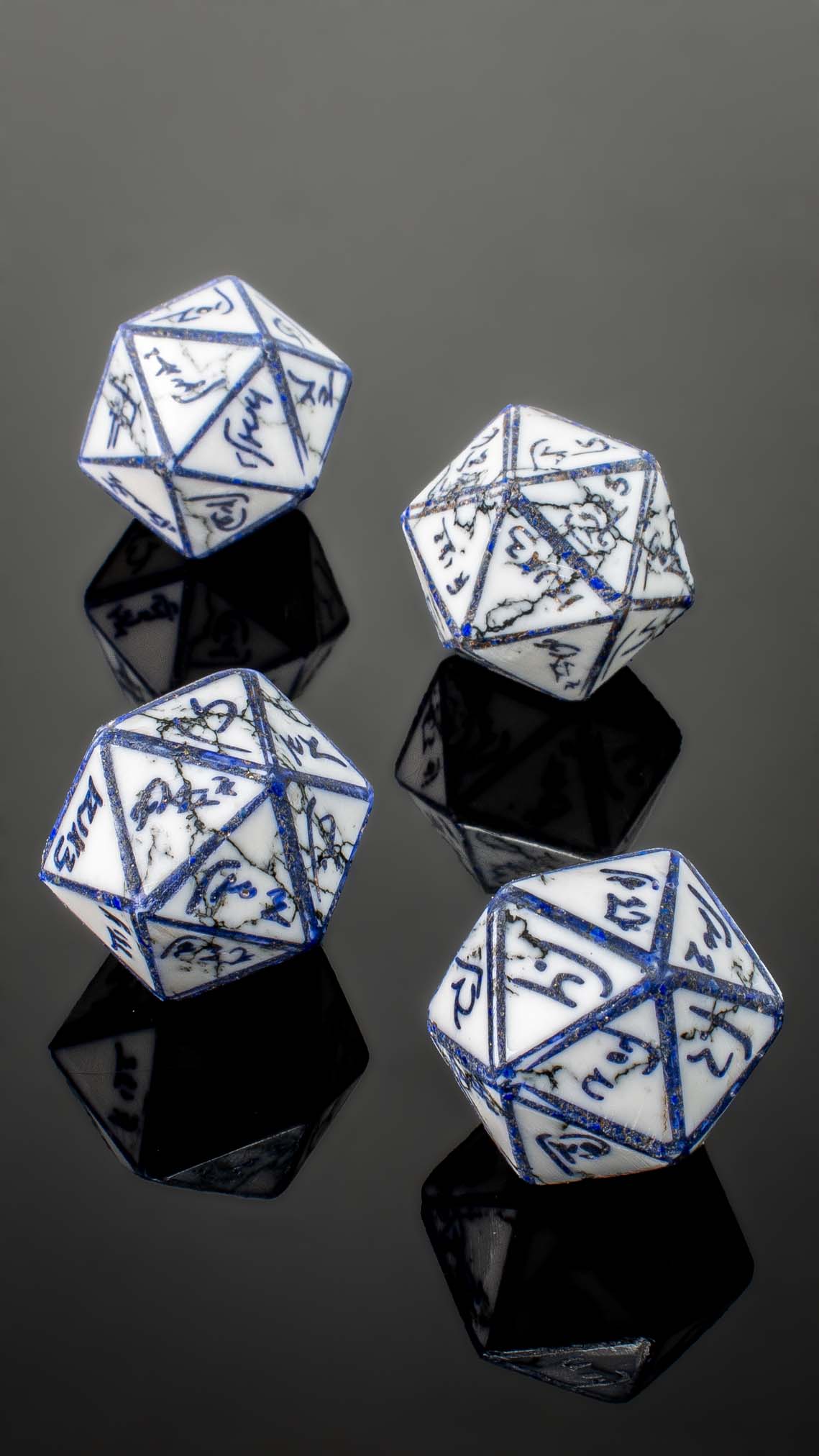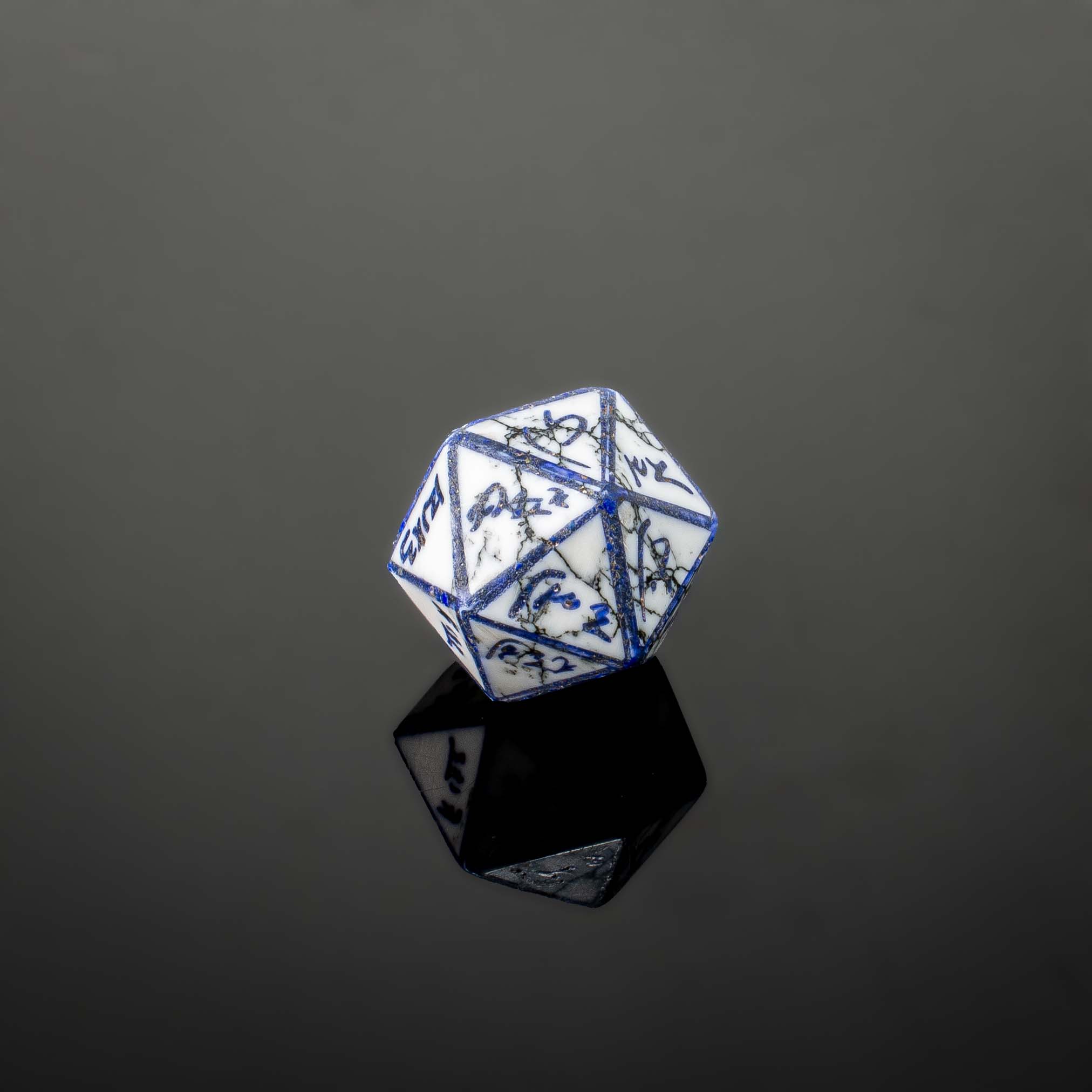 Introducing the crown jewel in our historical dice collection, the Demotic Icosahedron, inspired by the ancient artifact described by Martina Minas-Nerpel. This exquisite recreation is made from white turquoise and lapis lazuli inlay, capturing the essence of the ancient die while vastly improving its shape and appearance. Discovered in the Dakhleh Oasis, this twenty-sided die is the world’s oldest extant icosahedron.