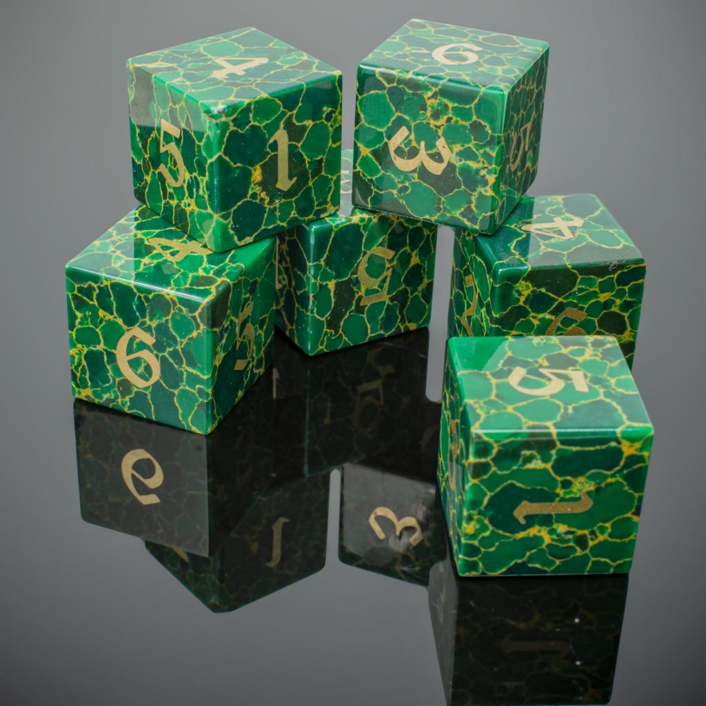 So how did we get around stones natural propensity to chip? Simple – we cheated. This new line of dice have been crafted from semi precious stone set in a resin matrix. The end result is flawless in execution, beauty, gameability (if that’s not a word, it is now). By binding the ground semi precious stone in a resin matrix, it adds a toughness to the resulting die that unaltered stone just doesn’t have while retaining all the visual properties and heft of the original stone.