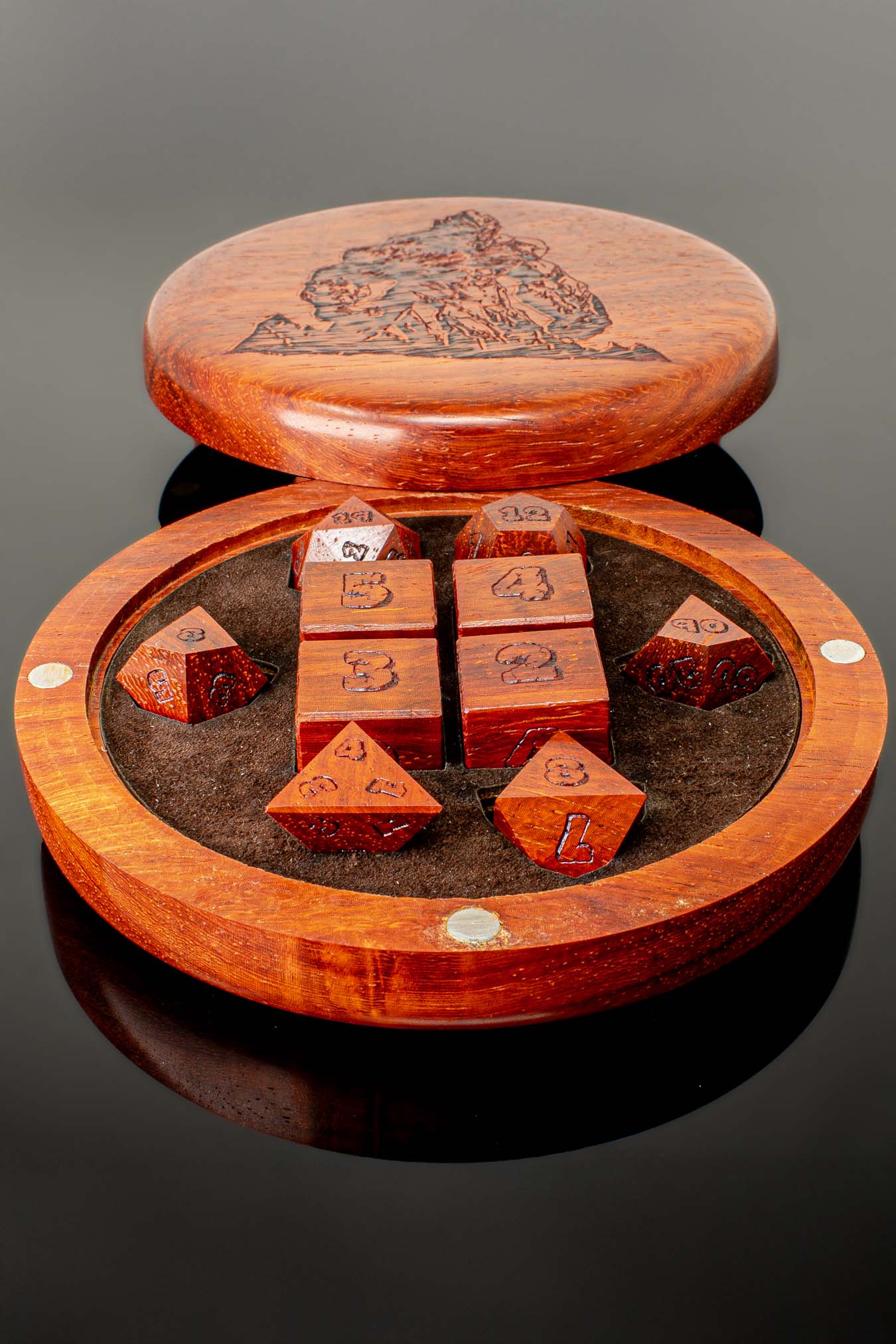 This set features a distinctive, craggy boulder-themed font, carved deep into the wood to evoke the rugged texture of stone. The centerpiece of this collection is the accompanying Padauk reliquary, a round dice box that not only protects your set but also serves as a beautiful display piece. Its lid is intricately engraved with a powerful lava elemental, a guardian with a molten core, ready to infuse your rolls with its ancient strength. Inside the lid you’ll find a built in padded rolling tray and a chocolate sued lined interior.