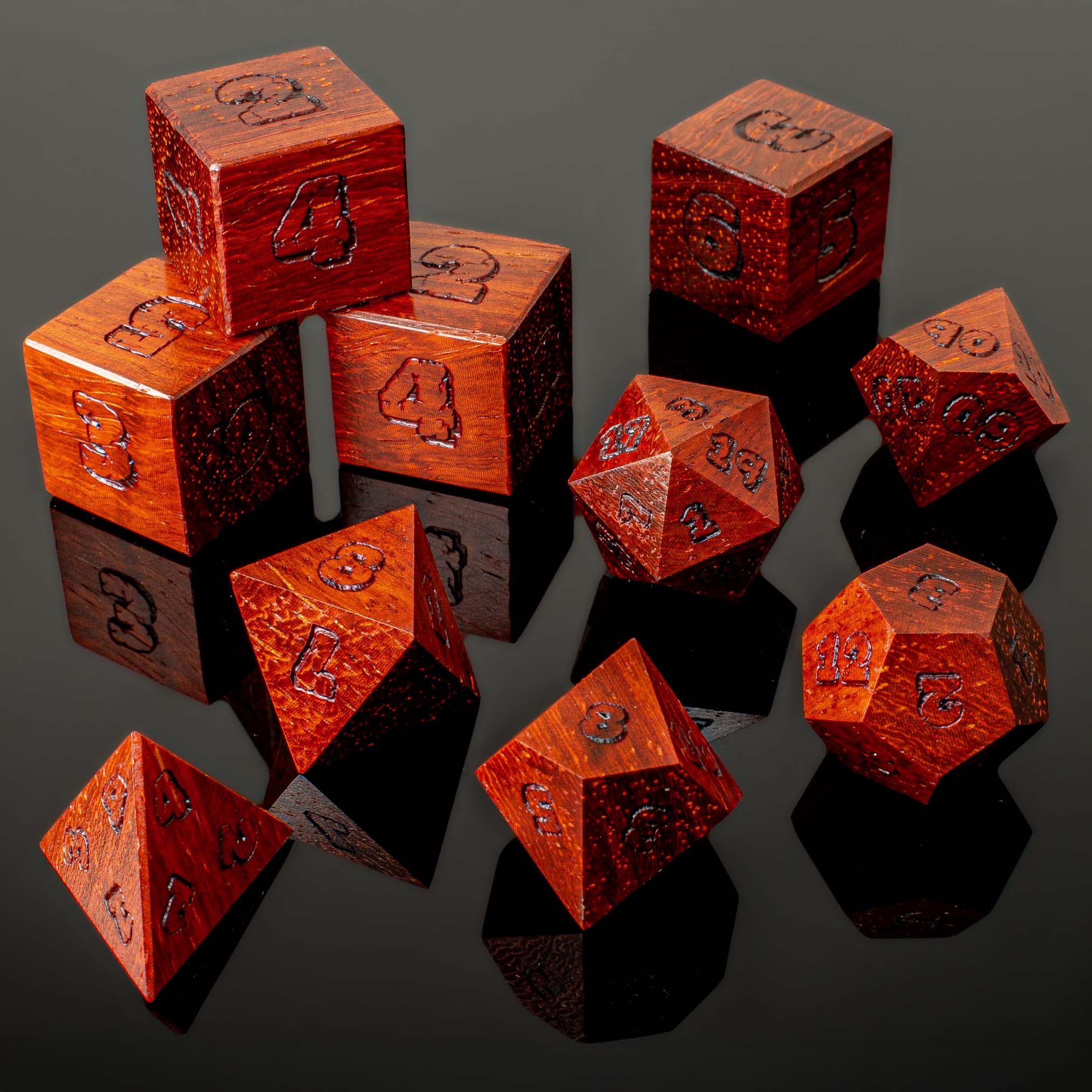 Unleash the primal force of the earth with our Lava Elemental Dice Set. This collection is meticulously crafted for those who dare to command the raw unbridled power of nature. Forged from genuine Padauk, and exotic African wood, each die boasts a fiery, reddish hue that deepens with age, embodying the heart of a volcano.