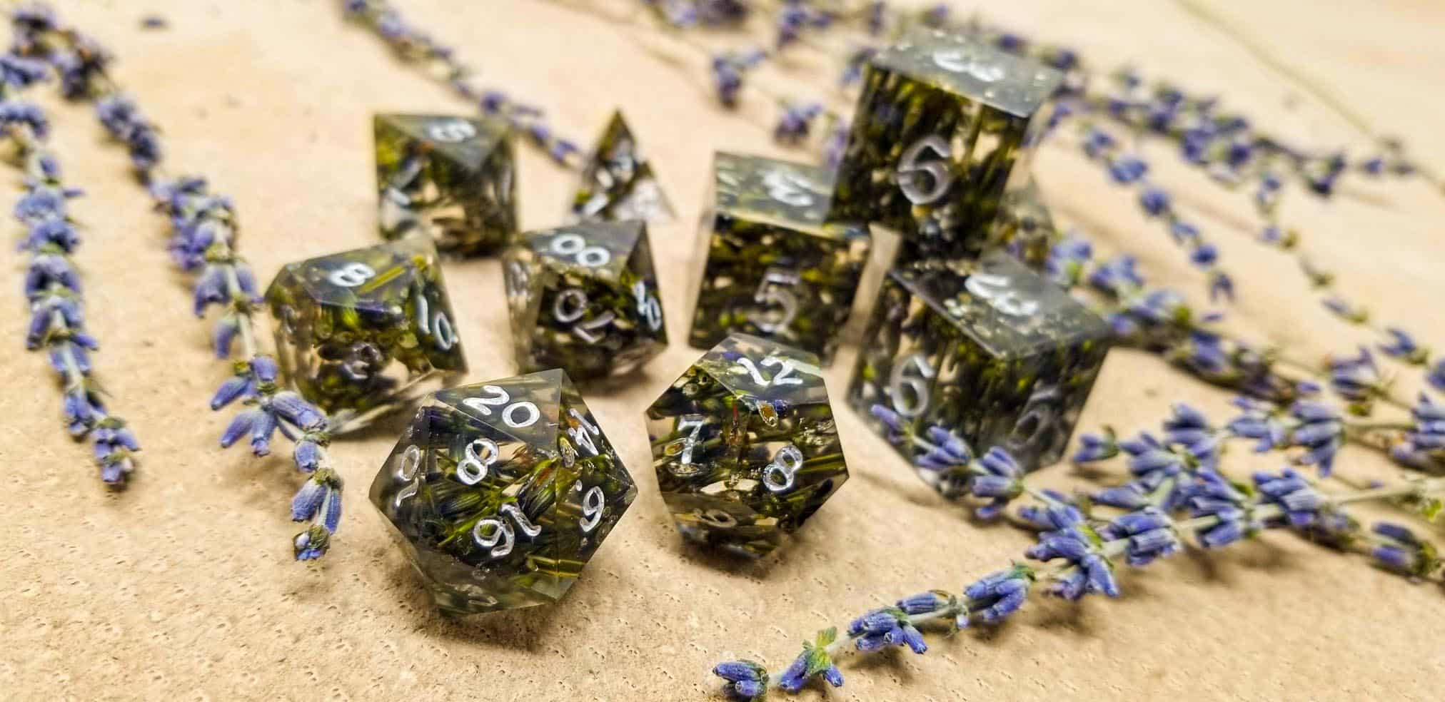 Our Lavender Dice are crafted from a clear resin cast with real lavender flowers in each die giving them a seriously strong lavender scent along with the beautiful lavender coloration of the green stems and lavender blooms. Inked in pearl silver, each number stands out in a striking contrast against the beautiful lavender hues of these dice. With our new Lavender Dice, your game nights will never smell the same again.