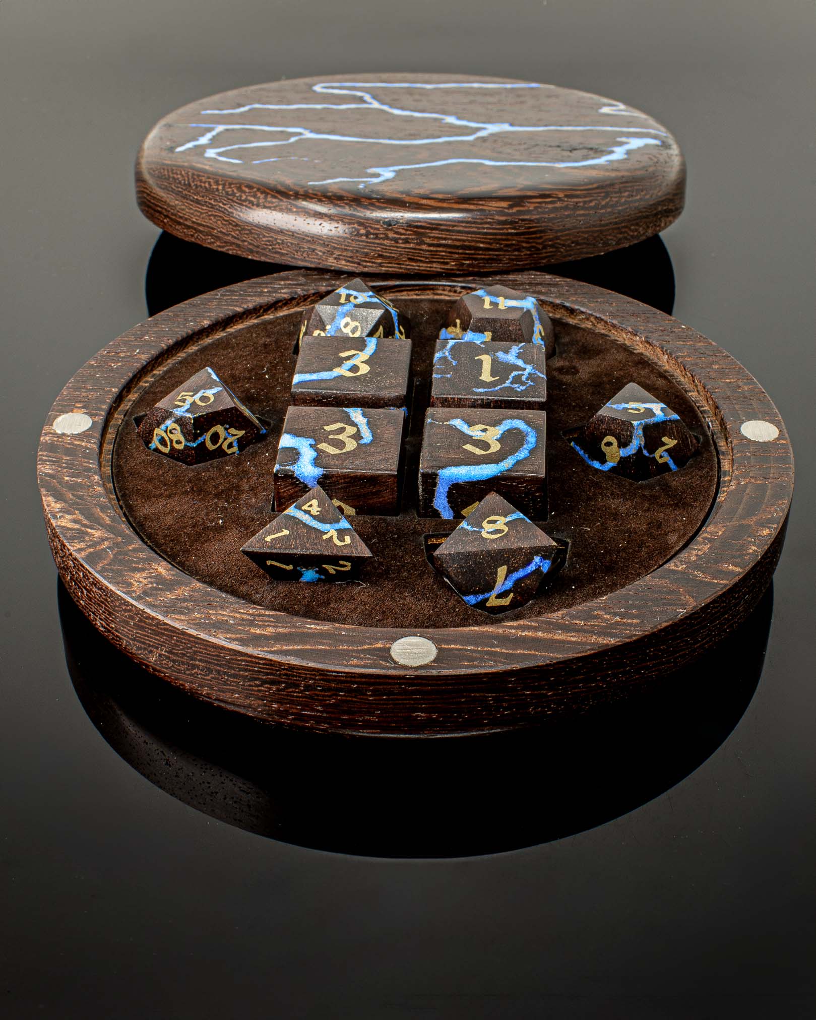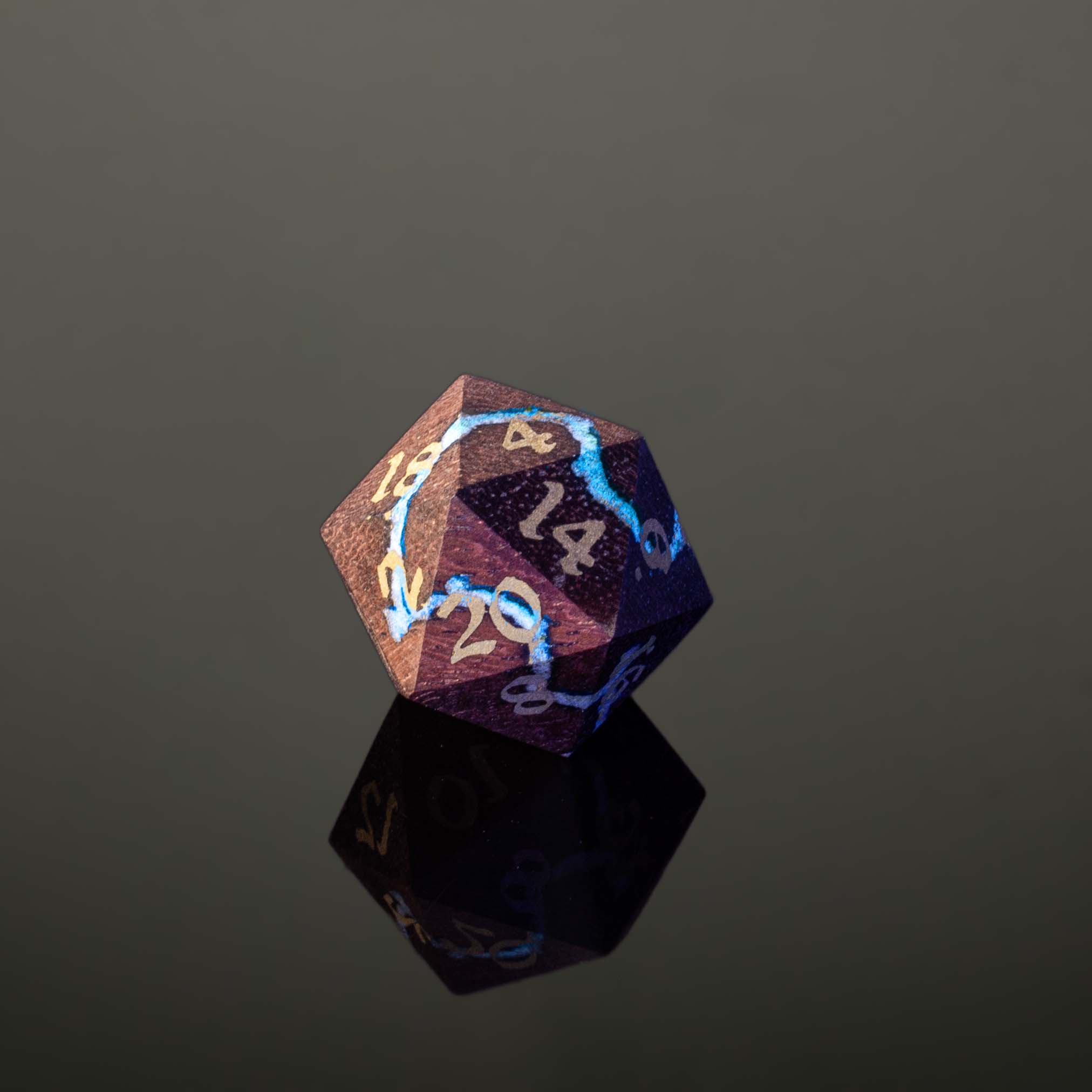 Crafted from the exotic Katalox, a strikingly dark fine-grained wood. Each die is zapped with a insanely high voltage electricity spike to produce stunning lightning strike patterns. The real magic lies in the aurora pigments, which create a mesmerizing display of color, visible even under normal lighting. These pigments are enhanced with a high-intensity UV LED flashlight, included with each set. Each set also encased in a matching Wenge Reliquary. Single D20’s come in one of our single d20 tins.
