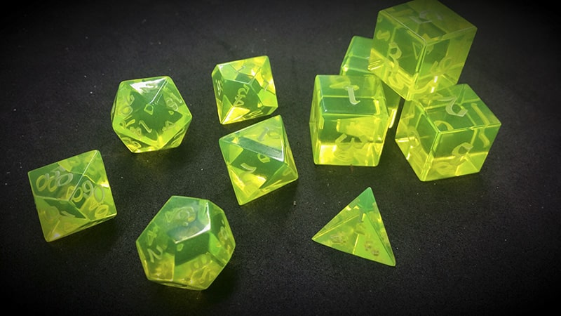 Each of our Acrylic dice are individually machined and the polished in 5 stages to bring back the optimal clarity and luster inherent to cast acrylic. This process is labor intensive, but it produces far superior results to injection molded acrylic dice.